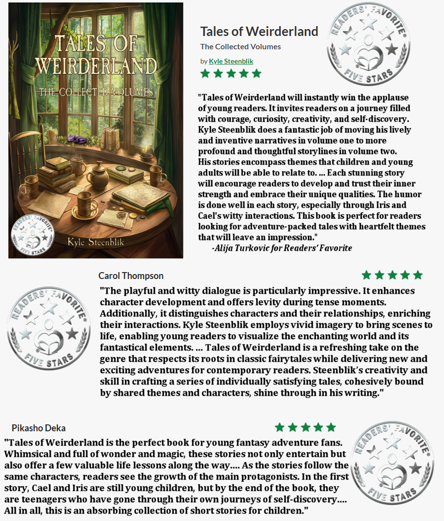 “ The playful and witty dialogue is particularly impressive. It enhances character development and offers levity during tense moments. Additionally, it distinguishes characters and their relationships, enriching their interactions. Kyle Steenblik employs vivid imagery to bring scenes to life, enabling young readers to visualize the enchanting world and its fantastical elements... Tales of Weirderland is a refreshing take on the genre that respects its roots in classic fairytales while delivering new and exciting adventures for contemporary readers. Steenblik's creativity and skill in crafting a series of individually satisfying tales, cohesively bound by shared themes and characters, shine through in his writing” — Carol Thompson for Readers' Favorite